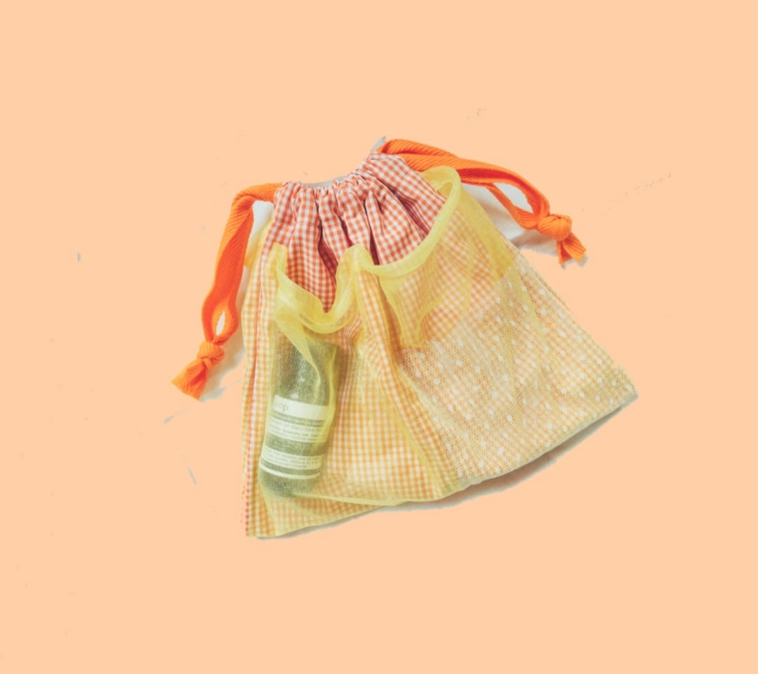 外側ポケットのオレンジチェック巾着です。